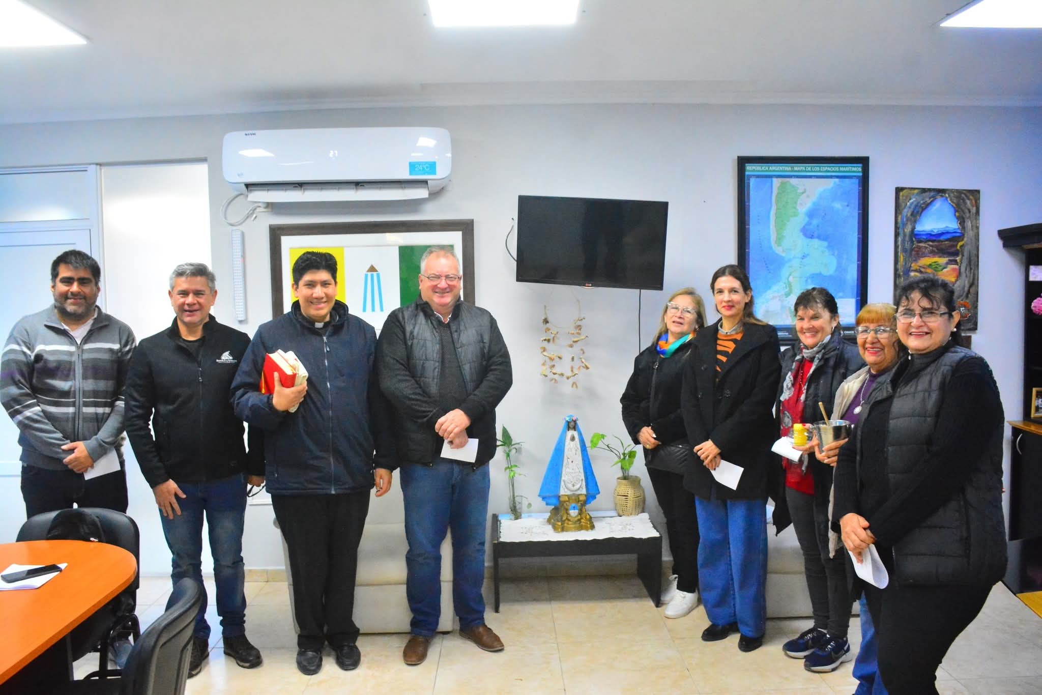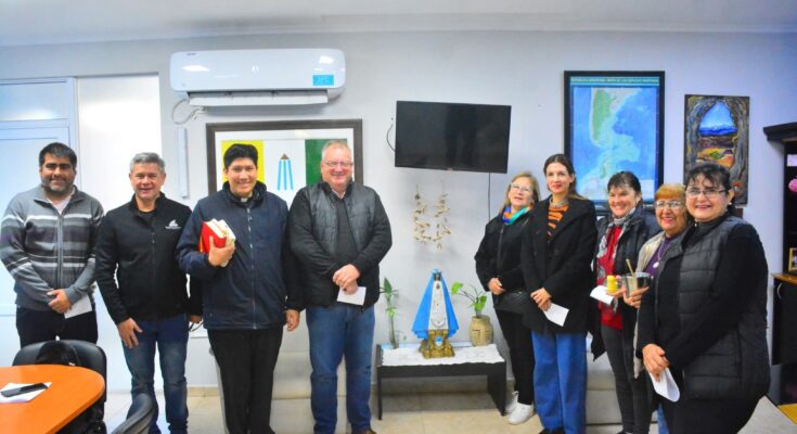 Hoy, el intendente Pío Sander recibió en su despacho a feligreses acompañados por el padre Ángel y la imagen de la Virgen. En este encuentro, compartieron un momento de oración dedicado al trabajo, a los funcionarios y al bienestar de toda la comunidad, en un gesto que refuerza la tradición y la devoción popular.