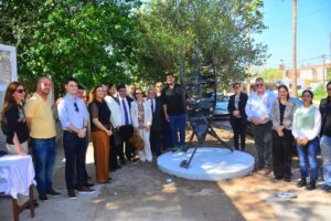 La presentación contó con la participación de autoridades universitarias como el procurador general Jorge Canteros, el decano Mario R. Villegas, el director Luis Alegre y las coordinadoras Graciela Loza y Cynthia Frías, además del intendente Pío Sander, la presidenta del Concejo Deliberante Soledad Rach y funcionarios municipales. La obra fue descubierta en un marco institucional y comunitario, reafirmando el valor de la integración del arte a los espacios públicos.