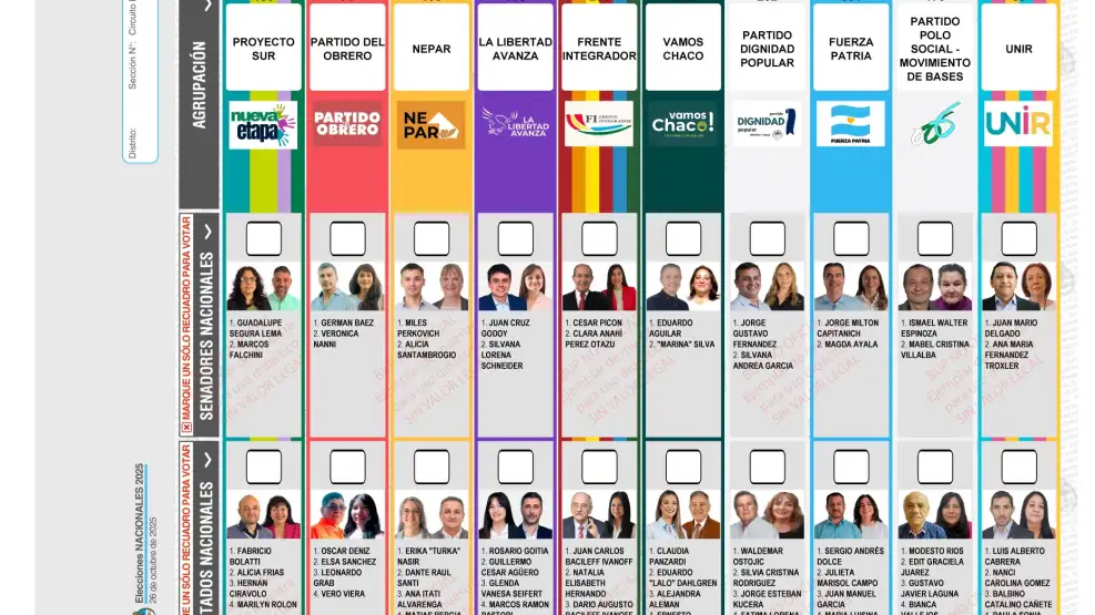 Cuándo es válido y cuándo no: tu voto es nulo si marcás más de una opción en la misma categoría o si adherís objetos/inscripciones extrañas; cada mesa resuelve con criterios uniformes y, si hay desacuerdo, interviene la junta electoral. Está prohibido sacar fotos de la boleta dentro de la cabina (artículo 71 del Código Electoral): podés votar igual, pero una denuncia puede derivar en sanción. Recordá: no se puede llevar boletas, solo el DNI; habrá dos cabinas que pueden usarse en simultáneo para agilizar la fila; y si tenés dudas, el presidente de mesa (en presencia de fiscales) puede explicarte el procedimiento y la oferta completa sin sugerir opciones.